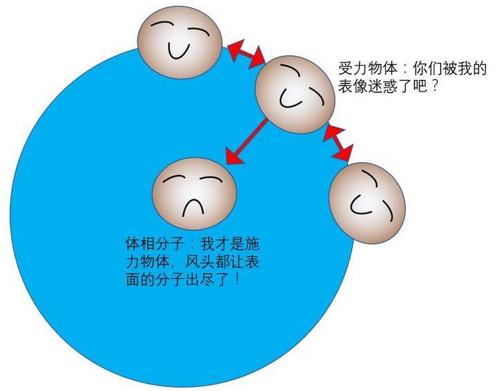 比如,當固體對液體分子吸引力較大時,即所謂的親水界面,也是表面能高的界面,F1會大于F2, 所以液面會上升,直到與重力平衡。即毛細管內液面上升現象。同時側面的作用力差別也會使液面更靠近固體。所以此時的施力物體是固體界面分子。作用效果是液面上升。