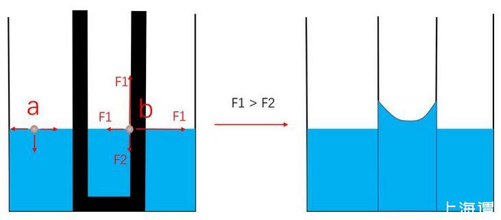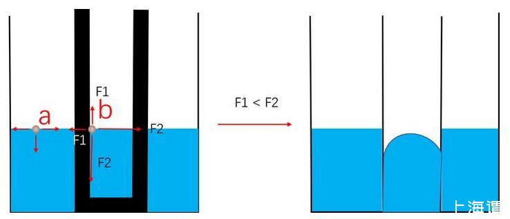 自由界面處的水分子只受到水分子的作用,如a處所示。而對于b處界面分子。其左側的分子被固體分子替代,這個替代產生了固液分子作用力(F1)與液液分子作用(F2)的差別,這個差別使液面運動。