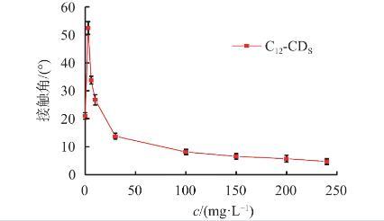 通過測試接觸角評價兩親性碳點的吸附性能,接觸角測定依據(jù)標準SY/T 5153—2017《油藏巖石潤濕性測定方法》。具體實驗步驟如下:將玻璃板浸泡在現(xiàn)配的食人魚溶液(濃硫酸∶雙氧水=3∶1)中1 min,進行表面羥基化的親水處理,再洗凈烘干;將玻璃板下半部浸泡在表面活性劑溶液中,上半部懸空,讓溶液保持攪拌狀態(tài),浸泡12 h后取出,自然晾干。利用光學接觸角測量儀(DSA100,Krüss,德國)測定表面活性劑溶液浸泡前后水滴在玻璃板上的靜態(tài)接觸角。玻璃的主要成分為硅酸鹽,因此可用玻璃板模擬硅酸鹽顆粒表面。通過測定玻璃板水滴靜態(tài)接觸角研究C12-CDS潤滑劑在玻璃表面的吸附性能,實驗結(jié)果見圖3。