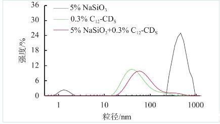 為進一步明確兩親性碳點對硅酸鹽溶液的潤滑機理,通過動態(tài)光散射儀(Malvern Zetasizcrnano ZS90,Malvern,英國)測定硅酸鈉溶液、硅酸鈉與兩親碳點和硅酸鈉與聚氧乙烯型表面活性劑的混合溶液水動力學直徑,其中散射角為173°,測試溫度為30℃。如圖6所示,質(zhì)量分數(shù)為5%的Na2SiO3粒徑分布在220~800 nm之間,平均粒徑約為514.0 nm;質(zhì)量分數(shù)為0.3%的C12-CDS溶液的粒徑主要分布在8~100 nm之間,平均粒徑為43.4 nm;而5%Na2SiO3+0.3%C12-CDS的混合溶液粒徑為10~120 nm,平均粒徑為63.2 nm,C12-CDS的加入使得Na2SiO3聚集體的尺寸大大降低,這表明C12-CDS可以讓Na2SiO3聚集體解聚,這與表面活性劑對膠體溶液的分散作用相關(guān)。由于大量C12-CDS分子或膠束吸附在Na2SiO3聚集體表面形成具有機械阻礙作用的水化膜,可對Na2SiO3聚集體起到穩(wěn)定分散作用。