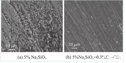 為研究兩親性碳點在硅酸鈉溶液中的摩擦學性能,利用SGW-10G型杠桿四球摩擦試驗機測試,測試方法參照行業(yè)標準SH/T 0189—92《潤滑油抗摩損性能測定法(四球機法)》,實驗參數(shù)設(shè)置如下,用掃描電鏡(SEM)拍攝摩擦表面形態(tài)圖片并分析如圖7所示。