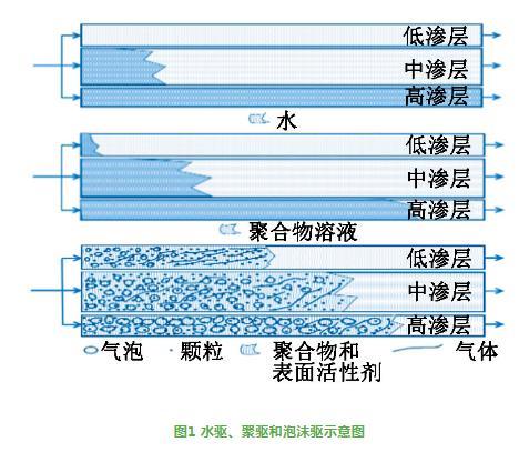 三相泡沫體系在聚驅后并聯巖心模型中,先進入高滲層,高滲層含油飽和度低、孔吼大,泡沫可形成有效封堵,并穩定向前運移;吸附作用導致前緣泡沫破裂后,聚合物和微納米顆粒還具有一定的堵調作用,有利于后續泡沫發揮更好的封堵作用。高滲層形成一定封堵后,泡沫進入中滲層,中滲層含油飽和度較高、孔吼較小,泡沫性能降低,經過孔喉剪切后泡沫變小,進入中滲層內部;在中滲層前緣主要以聚合物、顆粒、串流氣體和少量泡沫形態存在,推動剩余油向前運移,次前緣泡沫逐漸增多,即泡沫在中滲層具有調驅作用。中高滲層均形成一定堵調后,泡沫進入低滲層,低滲層含油飽和度最高、孔吼最小,泡沫性能明顯降低,且經過孔喉剪切后泡沫尺寸更小;低滲層前緣和次前緣主要以聚合物、顆粒和串流氣體形態存在,推動剩余油向前運移,即泡沫均勻驅替低滲層(圖1)。三相泡沫體系在聚驅后油藏具有自適應堵調驅作用,可大幅提高采收率。