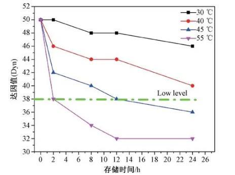 電暈后30℃存儲24 h后,耐候層達因值為46 mN/m;當升高存儲溫度至45℃時,12 h后達因值即降低到38 mN/m;當存儲溫度為55℃時,達因值衰減更為迅速,2 h后達因值降為38 mN/m。耐候層達因值隨著熟化溫度的升高,達因值衰減速率逐漸增大,因此若控制在38 mN/m以上,熟化溫度不能高于40℃,如圖3所示。