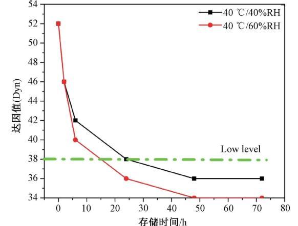 控制熟化溫度40℃,考察不同熟化濕度40%、60%下儲存不同時間耐候層達因值的變化規律,如圖4所示。對比兩種濕度下達因值的下降趨勢,60%的濕度環境達因值下降較快,在約24 h后達因值即已下降至38 mN/m以下。40%的濕度環境可維持38 mN/m的水平至少24 h。因此為保證耐候層達因值不低于38 mN/m,需嚴格控制所處環境濕度小于40%RH。