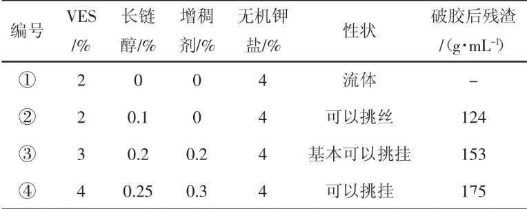 (1)甜菜堿型陽離子清潔壓裂液最優(yōu)配比為4%VES+0.25%長鏈醇+0.3%增稠劑+4%無機鉀鹽。