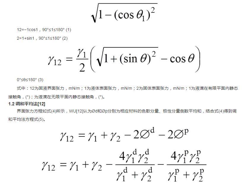 界面張力方程如式(4)所示,WU認為?d和?p分別為相應材料的色散分量、極性分量倒數平均和,結合式(4)得到調和平均法方程式(5)。