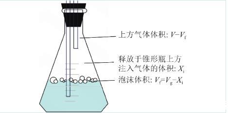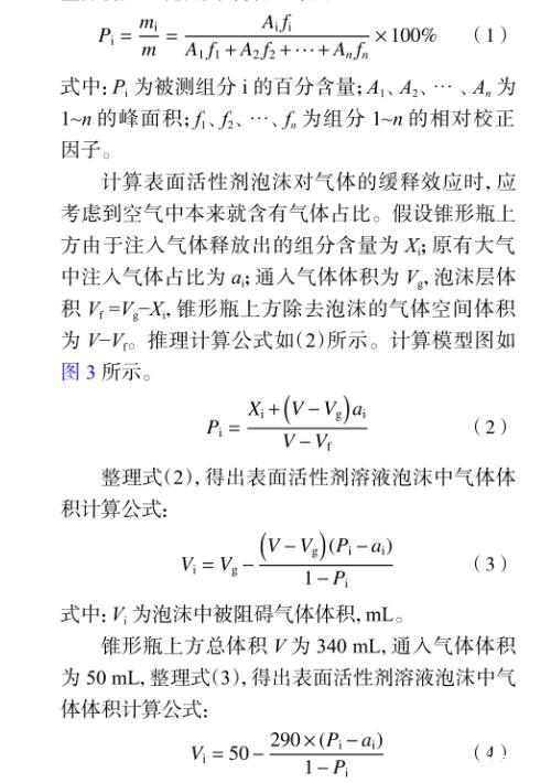 計算表面活性劑泡沫對氣體的緩釋效應時,應考慮到空氣中本來就含有氣體占比。假設錐形瓶上方由于注入氣體釋放出的組分含量為Xi;原有大氣中注入氣體占比為ai;通入氣體體積為Vg,泡沫層體積Vf=Vg?Xi,錐形瓶上方除去泡沫的氣體空間體積為V?Vf。推理計算公式如(2)所示。計算模型圖如圖3所示。