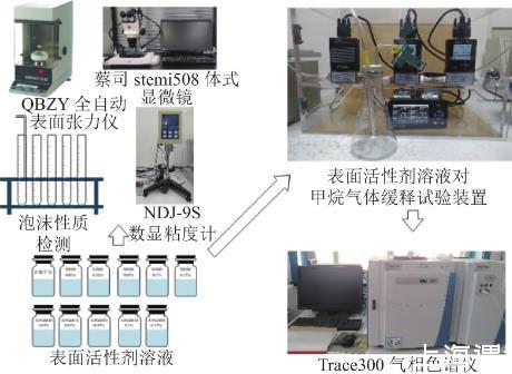 試驗流程如圖1所示。將兩種表面活性劑配置質量分數為0.01%、0.02%、0.05%、0.1%、0.15%的溶液,使用QBZY全自動表面張力儀對不同質量分數表面活性劑溶液以及去離子水進行表面張力測量,NDJ-9S數顯粘度計測表面活性劑溶液黏度,注氣法檢測溶液泡沫性質,蔡司stemi508體式顯微鏡觀察泡沫形態。上述基礎參數測定結束后,使用自行研制的表面活性劑溶液對甲烷緩釋試驗裝置進行泡沫對甲烷緩釋效應影響試驗,并采用Trace300氣相色譜儀定量檢測分析。