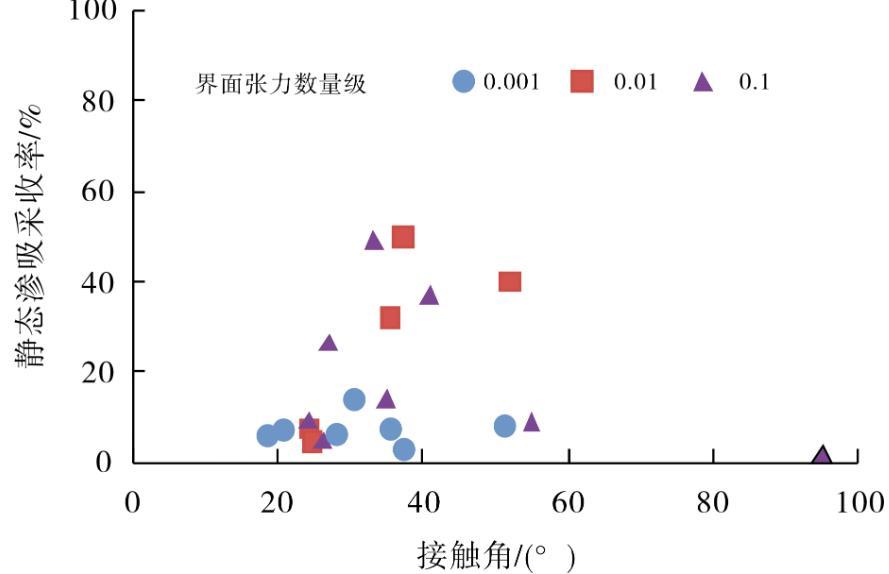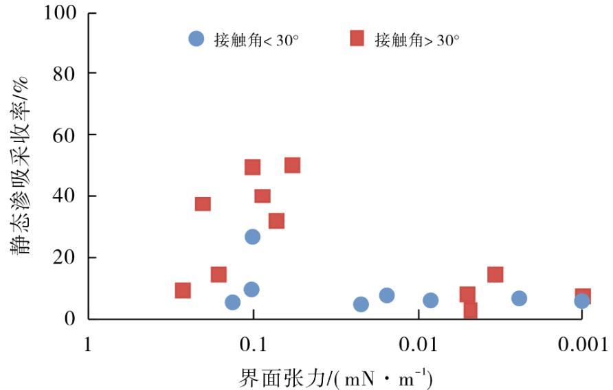 從圖1可知,界面張力大于0.01 mN·m-1時(shí),高接觸角時(shí)反而滲吸采收率整體更高。當(dāng)接觸角小于30°時(shí),靜態(tài)滲吸采收率最高為26.67%,平均為10.66%;當(dāng)接觸角大于30°時(shí),靜態(tài)滲吸采收率最高為50%,平均為33.15%。從圖2、表1可知,當(dāng)接觸角大于30°時(shí),滲吸液的界面張力平均為0.096 mN·m-1;當(dāng)接觸角小于30°時(shí),界面張力則減小到0.043 mN·m-1,這是由于低的接觸角需要更高的表面活性劑濃度(接觸角小于30°時(shí),表面活性劑濃度平均為0.259%;接觸角大于30°時(shí),表面活性劑濃度平均為0.190%),從而導(dǎo)致界面張力降低。因此,化學(xué)滲吸時(shí)若使用表面活性劑類潤(rùn)濕劑,應(yīng)使用合適的濃度,避免為了追求低接觸角導(dǎo)致界面張力過小。