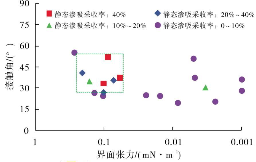 圖3界面張力-潤(rùn)濕性-靜態(tài)滲吸采收率關(guān)系