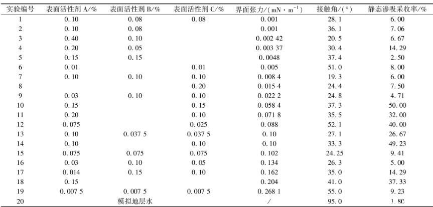 根據(jù)國內(nèi)外學(xué)者的研究,滲吸液對(duì)滲吸的影響主要是改變油水界面張力、潤(rùn)濕性、乳化性和pH值。乳化性主要是通過乳化分散,從而增強(qiáng)油滴在巖心孔道內(nèi)的流動(dòng)能力;pH值則主要是影響滲吸液的乳化能力。本次實(shí)驗(yàn)采取靜態(tài)滲吸的方式,乳化性的作用相對(duì)較小,故滲吸液配制指標(biāo)為界面張力與潤(rùn)濕性。