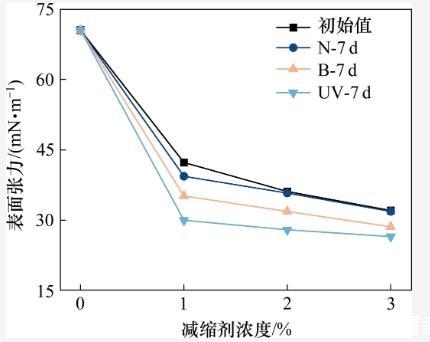 據以往研究,SRA在水泥基材料表面的吸附率通常在10%以下,90%以上的SRA分子溶于溶劑中(包含吸附在氣液界面上的部分)。因此,SRA減縮的理論基礎主要是毛細管張力理論。為了進一步探索減縮劑在強紫外線輻射環境下的作用機理,測試了減縮劑溶液的初始表面張力,以及溶液經過3種不同環境(N,UV,B)處理7 d后的表面張力。試驗結果如圖8所示。