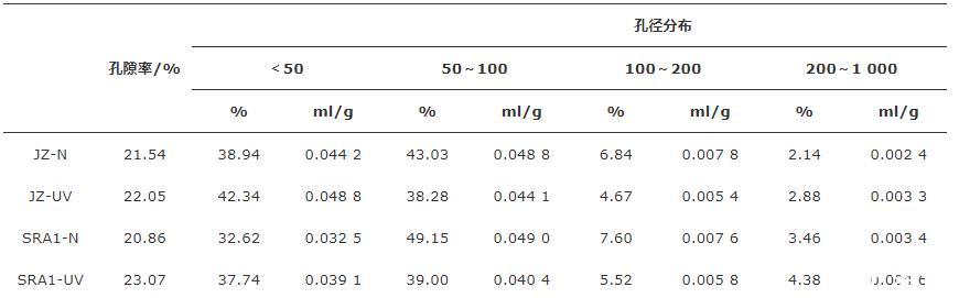 由圖7和表5可以看出:強紫外線輻射使各組樣品的總孔隙率、介孔率(2~50 nm)及大孔率(尤其是200 nm以上的孔)增加,由于彎月面的表面張力效應,介孔的毛細管產生更高的毛細管應力,導致暴露在強紫外輻射環境中的水泥石產生更大的干燥收縮。同時,經過強紫外線照射后,樣品中大于200 nm的孔隙比例增加。這是由于強紫外線輻射環境下,水泥凈漿的水化程度降低及水分散失增加導致的。