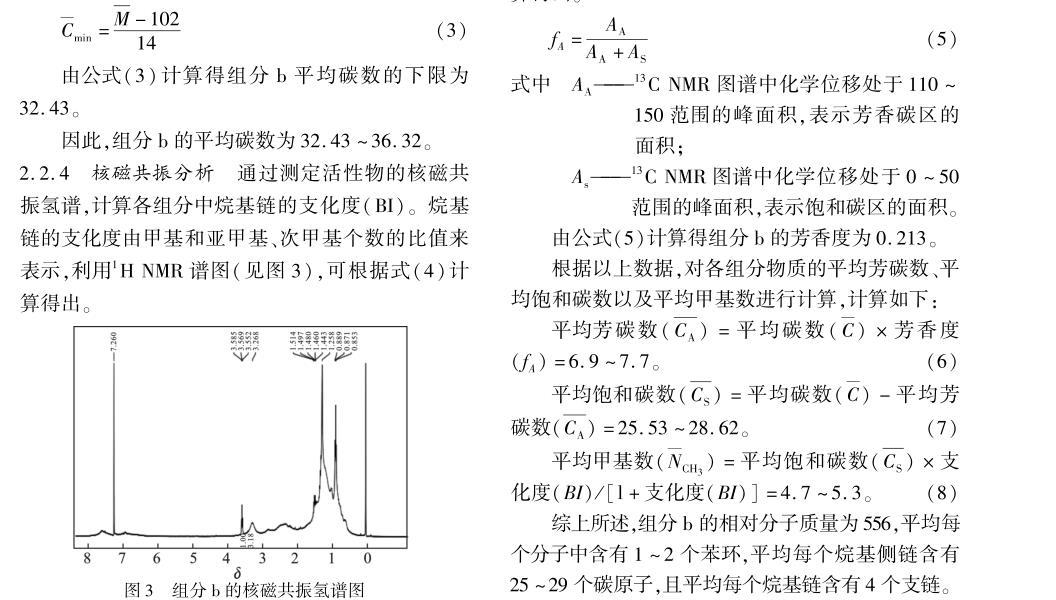 綜上所述,組分b的相對分子質(zhì)量為556,平均每個分子中含有1~2個苯環(huán),平均每個烷基側(cè)鏈含有25~29個碳原子,且平均每個烷基鏈含有4個支鏈。