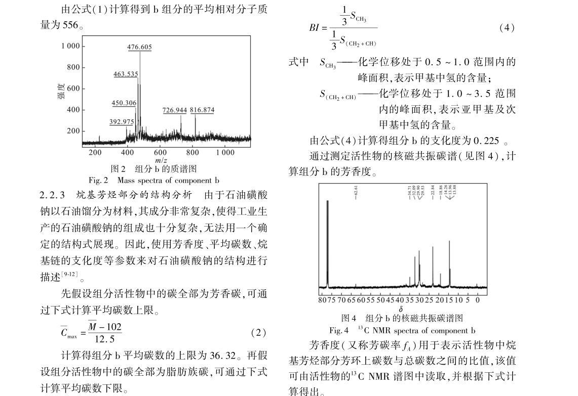 由上可知,只有組分b的界面張力達(dá)到超低,說明石油磺酸鹽中主要起作用的物質(zhì)集中在組分b中,因此對組分b采用紅外光譜、質(zhì)譜、核磁共振等方法測定其結(jié)構(gòu),并通過理論計(jì)算與實(shí)驗(yàn)數(shù)據(jù)相結(jié)合,推斷組分b的大致分子結(jié)構(gòu)。