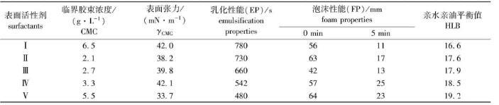 2.2.2 EP、FP和HLB值5種表面活性劑的乳化性能、泡沫性能及親水親油平衡值如表2所示。