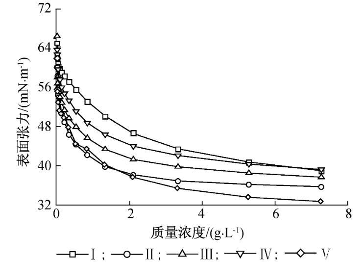 由圖3可見,25℃時表面活性劑的表面張力隨著溶液質量濃度的增大而減小。當濃度達到一定值時,溶液表面張力降到最低值,此時再增加質量濃度,溶液表面張力幾乎不變。表面活性劑的CMC值和γCMC具體見表2。由表2可知,5種表面活性劑Ⅰ、Ⅱ、Ⅲ、Ⅳ和Ⅴ的CMC值分別為6.5、2.1、2.7、3.3和5.5 g/L,對應的γCMC分別為42.0、38.2、39.8、42.1和33.7 mN/m。CMC和γCMC隨著聚乙二醇相對分子質量的增大呈現先減小后增大的趨勢,化合物Ⅱ的CMC值和γCMC最佳。