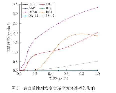從表4和圖3可以看到,在0.000 1~1 g/L的濃度范圍內(nèi),煤塵的沉降時間隨表面活性劑濃度的增大而減小,沉降速率則隨濃度的增大而增大。當(dāng)濃度小于0.005 g/L時,煤塵在8種表面活性劑溶液中的沉降時間均大于1 h,沉降速率接近于0,在溶液表面會形成一層黑色的“膜”,煤塵無法沉降。隨著表面活性劑溶液濃度增大,煤塵的沉降時間將會縮短,速率會增大,當(dāng)濃度超過臨界膠束濃度后,溶液表面張力隨濃度增加不再改變,但沉降時間會繼續(xù)縮短,沉降速率會繼續(xù)增大,這可能是由于煙煤的煤塵具有較大的比表面積和孔隙率,表面活性劑濃度的增大,更多的表面活性劑分子有機(jī)會吸附于煤塵上,加快了煤塵沉降。陰離子和非離子表面活性劑的溶液濃度對潤濕煤塵作用的影響較大,當(dāng)表面活性劑濃度從0.1 g/L增大到0.2 g/L時,煤塵在SDBS和JFC中的沉降時間分別從58.17 min和22.75 min迅速降至7.3 min和4.73 min;當(dāng)表面活性劑濃度從0.005 g/L增大到0.05 g/L時,煤塵在AOT和APG的沉降速率分別從0002 2 g/min和0.002 5 g/min迅速增至005 g/min和0.33 g/min。而在0.000 1~1.0 g/L的實(shí)驗(yàn)濃度區(qū)間內(nèi),濃度對陽離子和兩性型表面活性劑潤濕煤塵作用的影響都較小,潤濕煤塵效果較差。SDBS,AOT,APG和JFC4種表面活性劑濃度分別達(dá)到0.5,0.1,0.02和0.5 g/L時,煤塵在溶液中的沉降時間小于1 min,速率大于1.0 g/min,煤塵效果好。