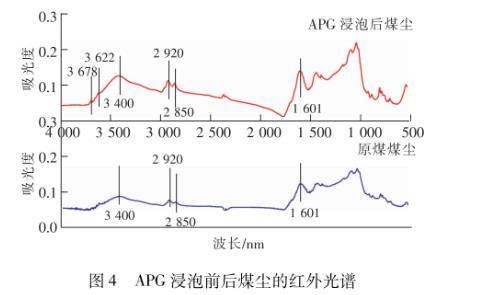 由上述實(shí)驗(yàn)結(jié)果可以看到,在8種表面活性劑中,非離子表面活性劑APG形成膠束和降低表面張力的能力最強(qiáng),潤濕煤塵效果最好。通過測定APG浸泡前后煤塵表面官能團(tuán)及粒徑分布特征的變化,分析其潤濕煤塵的作用機(jī)理。