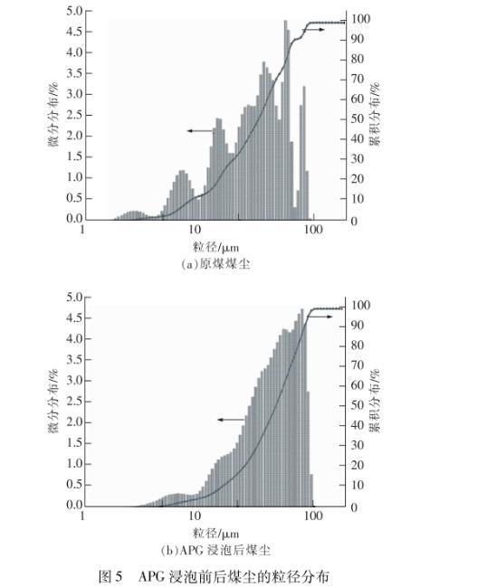 由圖5可見,經(jīng)APG浸泡后煤塵粒徑增大。原煤煤塵的平均粒徑為22.62μm,經(jīng)APG浸泡后增大到3518μm。浸泡前煤塵的粒徑分布不均勻,粒徑眾數(shù)為48.41μm,浸泡后煤塵粒徑的均一性增強(qiáng),呈較典型的正態(tài)分布,粒徑眾數(shù)也增大至76.51μm。這說明煤塵表面親水官能團(tuán)的增加和分子間締合氫鍵的形成,促使煤塵之間發(fā)生了團(tuán)聚作用,使原本無法發(fā)生重力沉降的“小粒徑”煤塵變成了能夠發(fā)生重力沉降的“大粒徑”顆粒,加快了沉降速率,縮短了沉降時間,與煤塵沉降實(shí)驗(yàn)結(jié)果一致。