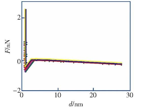納米氣泡的高度在8~20 nm范圍之內(nèi),直徑在100~500 nm范圍之內(nèi),圖3c為圖3b中典型納米氣泡的截面圖。掃描得到納米氣泡圖像以后,在該表面上進(jìn)行力曲線測(cè)量實(shí)驗(yàn),如圖2b所示。所有離曲線的‘跳進(jìn)’距離均大于10 nm且是變化的,同時(shí),由雙電層引起的斥力也消失了,不符合DLVO理論。這種‘跳進(jìn)’距離不同的長(zhǎng)程力應(yīng)該是因?yàn)榇?水替換后HOPG表面上生成的納米氣泡造成的。圖3b中納米氣泡的覆蓋率約為21.8%,在該表面不同位置測(cè)量得到的力曲線必然會(huì)存在探針-HOPG相互作用的情況,即不都是探針-氣泡的相互作用的情況。然而,根據(jù)醇-水替換前后多次測(cè)量力曲線得到“跳進(jìn)”距離d的統(tǒng)計(jì)分析(圖4a和圖4b),醇-水替換前測(cè)量得到的力曲線的“跳進(jìn)”距離大部分都小于5 nm(99%),而醇-水替換后測(cè)得的力曲線的“跳進(jìn)”距離均大于10 nm。這表明,醇-水替換后即使不是探針-氣泡相互作用的情況下,探針與HOPG表面的相互作用時(shí)仍然存在長(zhǎng)程引力,而這應(yīng)該是IGE造成的。該研究結(jié)果與Peng等人的研究結(jié)果一致,驗(yàn)證了Limbeek對(duì)IGE與納米氣泡共存的假設(shè)。
