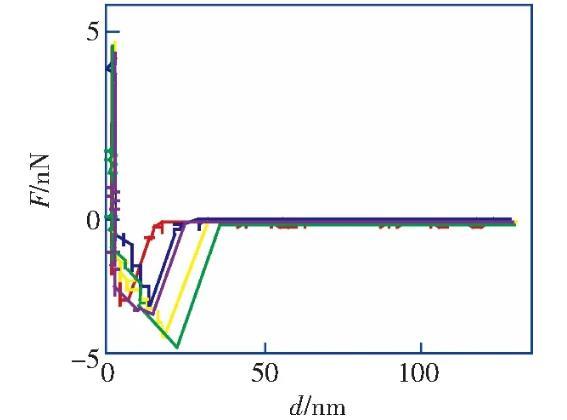 筆者利用原子力顯微鏡實(shí)驗(yàn)測(cè)量了HOPG表面在醇-水替換前后的力距離曲線,發(fā)現(xiàn)醇-水替換前進(jìn)針曲線的跳進(jìn)距離小于5 nm,滿足DLVO理論;而在醇-水替換后納米氣泡覆蓋率為21.8%的情況下,進(jìn)針曲線的跳進(jìn)距離均大于10 nm,不能再用DLVO理論解釋,證明了IGE與納米氣泡共存這一現(xiàn)象。根據(jù)改進(jìn)的Laplace-Young方程,結(jié)合文獻(xiàn)中對(duì)納米氣泡線張力值的計(jì)算結(jié)果,分析負(fù)的線張力對(duì)過渡區(qū)內(nèi)局部表面張力及局部固-液界面的影響,導(dǎo)致納米氣泡的接觸角反常小的原因之一。分析并討論雜質(zhì)對(duì)納米氣泡接觸角的影響,指出IGE與納米氣泡共存、線張力及雜質(zhì)影響的共同作用是導(dǎo)致納米氣泡接觸角“反常小”的原因。
