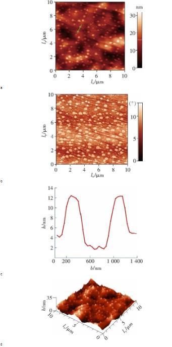 圖2a是探針在超純水中HOPG表面測(cè)得的力-位移曲線,當(dāng)分離距離大于5 nm時(shí),針尖和表面之間的作用力主要為斥力。由于實(shí)驗(yàn)中的水呈弱酸性(PH約5.6),而研究表明,HOPG表面在弱酸性水中帶弱負(fù)電荷,探針針尖(單晶硅)在水中也認(rèn)為是帶弱負(fù)電荷。因此,這個(gè)斥力可以解釋為雙電層(Electrostatic double layer,EDL)引起的。當(dāng)分離距離小于5 nm時(shí),在范德華力的作用下,針尖產(chǎn)生‘跳進(jìn)’(jump in)現(xiàn)象并與HOPG表面接觸,整個(gè)力曲線符合DLVO理論。醇-水替換之后,在10 10掃描區(qū)域內(nèi)采用Taping-Mode模式(95%的set-point)以1 Hz的掃描頻率,如圖3a所示,HOPG表面上生成的納米氣泡呈球冠狀,相應(yīng)的三維圖如圖3d所示。