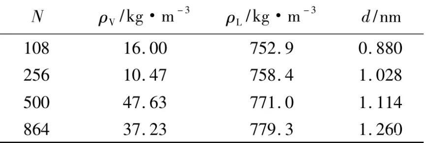 在溫度500 K和截?cái)喟霃絩c=0.9498 nm的條件下,當(dāng)模擬分子數(shù)N=108、256、500和864時(shí),模擬得到的密度分布見(jiàn)圖9。統(tǒng)計(jì)得到的汽相主體密度ρV、液相主體密度ρL及汽液界面厚度d見(jiàn)表5。