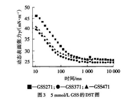 當(dāng)溶液濃度c為1 mmol/L(c<cmc)時(shí),由圖2可知,表面活性劑GSS271、GSS371和GSS471均表現(xiàn)為典型的DST變化曲線,即開始時(shí)DST接近溶劑的表面張力,后隨時(shí)間延長先快速下降,下降至一定數(shù)值后降速緩慢,最后DST基本保持不變。因?yàn)槲絼傞_始時(shí)GSS在新鮮的氣液界面吸附量很少,所以界面張力接近溶劑的表面張力,隨著時(shí)間的推移,GSS分子逐漸吸附在界面,氣液界面張力降低;隨著吸附的進(jìn)行,界面逐步趨于飽和,吸附推動力減小,GSS分子在界面吸附速率下降,因而DST下降緩慢最后趨于介平衡。GSS分子在界面達(dá)到飽和后還需進(jìn)一步吸附與定向排列,因而DST曲線中的介平衡張力較對應(yīng)濃度下的靜態(tài)表面張力大。當(dāng)溶液濃度為5 mmol/L時(shí),由圖3僅觀察到DST快速下降區(qū)和介平衡區(qū)。因?yàn)闈舛容^高(c>cmc),開始時(shí)便有較多的表面活性劑分子被吸附到表面,所以DST低于溶劑表面張力。