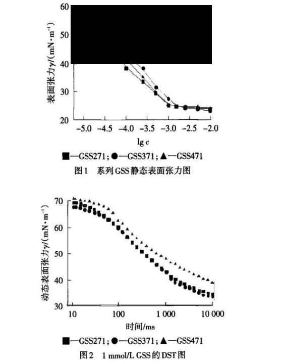 雙磺基琥珀酸酯磺酸鈉(簡稱GSS)通過柔性連接基將兩個(gè)傳統(tǒng)的琥珀酸酯鹽連接而成,連接基使GSS分子中兩個(gè)離子頭基間的靜電斥力大大削弱,同時(shí)加強(qiáng)了碳?xì)滏滈g的疏水結(jié)合力,使GSS具有比單鏈琥珀酸酯磺酸鹽更低的臨界表面張力。