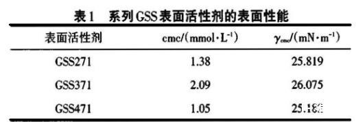 由表1可知,3種表面活性劑中GSS471的cmc較小,GSS271的cmc與之接近,GSS371的cmc最大。對于GSS371,由于連接基使兩條疏水鏈間的距離增大,導(dǎo)致疏水相互作用減弱,因而cmc較大;GSS371在表面定向排列疏松,在氣液界面置換的水分子較少,因此γcmc較大。連接基較短的GSS271,兩條疏水鏈距離較小,增強(qiáng)了疏水相互作用,cmc小;在表面排列較緊密致使γcmc較小。對于有較長連接基的GSS471,由于連接基的柔性作用使連接鏈扭曲變形而導(dǎo)致兩條疏水鏈更靠近,化學(xué)鍵又使極性頭基被強(qiáng)制在較小的距離內(nèi),兩種因素均使GSS471疏水能力增強(qiáng)[15],分子更易聚集在一起,因而cmc小;同時(shí)在表面排列更緊密,因而γcmc最小。