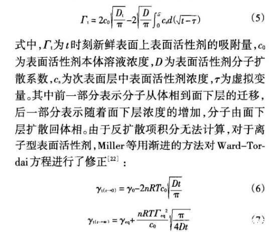 表面活性劑分子在新鮮表面上的吸附分兩步進行:(1)分子從本體溶液到次表面的遷移;(2)分子在次表面和表面間的吸附平衡。在動態吸附模型的基礎上提出了兩種主要的動態吸附機理:擴散控制吸附、混合動力控制吸附。