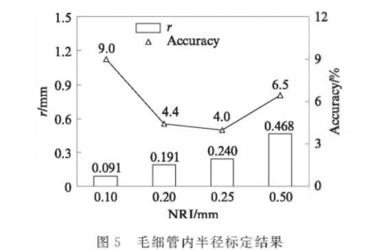 用式(2)標定毛細管的內半徑r,結果見圖5.由圖5可見:與毛細管的生產標號相比,毛細管的實測內半徑減小了4.0%——9.0%.這是由于式(2)同時考慮了接觸角與修正高度對內半徑標定的影響。