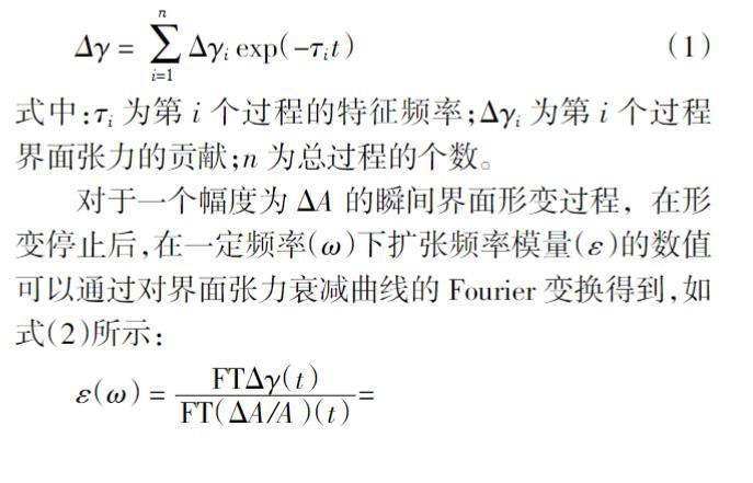 周期振蕩法雖然是目前研究界面膜流變性質的主要實驗方法,但受限于當前的儀器條件,工作頻率較低,一般不高于1 Hz。而表面活性劑分子的擴散-交換、界面上單分子的取向變化等過程的特征弛豫時間較快,大于1 Hz,這就導致周期振蕩法獲得的信息有限。界面張力弛豫法是擴張流變研究手段的重要組成部分,它通過對界面張力的衰減曲線進行多指數擬合,計算得到不同頻率下的擴張流變參數,能夠從理論上獲得擴張彈性和黏性的全頻率譜,是周期振蕩法的有效補充。