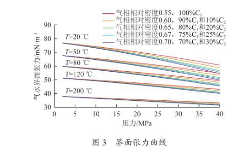 如圖3所示為利用新模型繪制的不同溫度和壓力下的界面張力曲線。從圖中可知,壓力越大,溫度越高,氣水界面張力越小;氣體相對密度越大,氣水界面張力越小。當(dāng)壓力和溫度分別為0~40 MPa和20~200℃時,界面張力范圍為30~75 mN/m,不能看成常數(shù)。