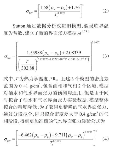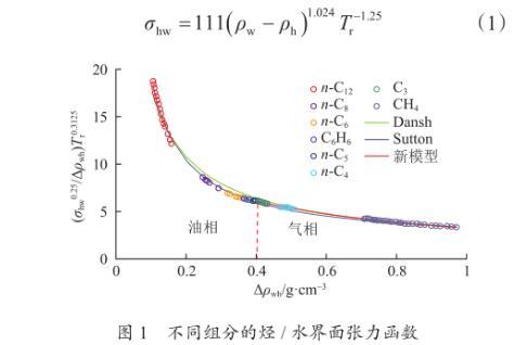 式中,Δρwh為烴水密度差,g/cm3;σhw為烴水、氣水或者油水界面張力,mN/m;ρw為水的密度,g/cm3;ρh為烴的密度或者氣和油的密度,g/cm3;Tr為擬對比溫度。