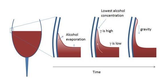 隨著彎月面開(kāi)始在玻璃杯的壁面形成一層膜,其中的酒精進(jìn)一步揮發(fā),造成了更大的表面張力梯度。更多的葡萄酒被拉到玻璃杯壁上,直到形成液滴。此時(shí)重力將起作用,酒淚沿玻璃杯壁流回葡萄酒的主體內(nèi)。