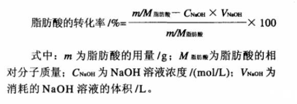 脂肪酸轉(zhuǎn)化率的測定:以酚酞為指示劑,用0.05mol/L NaOH溶液滴定反應液中未反應完的脂肪酸量。計算脂肪酸的反應轉(zhuǎn)化率。