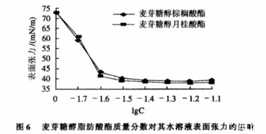 測得本產品麥芽糖醇脂肪酸酯水溶液質量分數為0.06%時,表面張力為38~40mN/m。