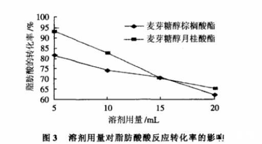 綜合上述實驗結果,以脂肪酶Novozym 435為催化劑,用量為0.24g/mmol脂肪酸,脂肪酸用量為1mmol,麥芽糖醇用量為2.0mmol,溶劑用量為10mL,在60℃條件下反應80h,棕櫚酸和月桂酸的轉化率分別達91%和95%。該結果是本實驗條件范圍內的最好結果。
