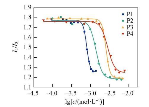 由圖3可見,當表面活性劑的濃度較低時,I1/I3在1.70——1.80之間波動;當表面活性劑濃度逐漸增加至cmc時,I1/I3值急劇下降,說明表面活性劑分子開始形成膠束,使得芘分子轉移至疏水膠束內,芘分子所處的環境極性發生突變;在較高表面活性劑濃度下,I1/I3值趨于穩定,這是由于芘分子已經完全處于膠束中,所處的環境極性不再發生變化。通過Boltzmann方程擬合得到表面活性劑P1,P2,P3和P4的cmc值分別為7.96×10-4,1.39×10-3,2.57×10-3和2.85×10-3 mol/L。結果表明,隨著聚氧乙烯鏈長度的增加,cmc逐漸增大。采用熒光法測得的cmc與采用表面張力法測得的cmc數值接近且變化趨勢一致。