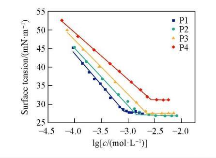 為研究4種非離子Gemini表面活性劑的表面活性,采用液滴體積法測定了不同濃度下的表面張力。圖2示出P1,P2,P3和P4的溶液表面張力與濃度對數的關系。溶液的表面張力隨濃度的增加而降低,當溶液的濃度高于cmc后,表面張力達到最低值并基本趨于穩定。這是由于隨著表面活性劑濃度的升高,在氣/液界面上吸附的表面活性劑分子數量增多,界面上的分子排列越來越緊密,表面張力持續下降;當表面活性劑濃度達到cmc后,溶液內部的分子開始聚集形成膠束聚集體,表面活性劑分子在界面上達到飽和吸附,因此cmc之后表面張力趨于穩定。