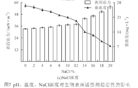 如圖7(c)所示,隨著NaCl濃度增加,萘濃度顯著下降(P<0.05),但NaCl濃度在8%以內(nèi),萘濃度均高于21 mg/L,表明生物表面活性劑對萘的增溶穩(wěn)定;而液體表面張力總體呈現(xiàn)上升的趨勢,其中,NaCl濃度12%以內(nèi),液體表面張力變化不顯著(P>0.05),說明菌株BD-2產(chǎn)的生物表面活性劑能夠在一定鹽度范圍內(nèi),較好地降低液面張力。
