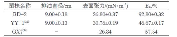 通過驅(qū)油試驗、表面張力和乳化指數(shù)的測定對菌株BD-2產(chǎn)生的生物表面活性劑性能進行分析,并與其他研究菌株比較,結(jié)果見表1。菌株BD-2產(chǎn)生的表面活性物質(zhì),能夠形成直徑約為9.0 cm的排油圈,可以將發(fā)酵液的表面張力由68.30 mN/m降到26.80 mN/m,乳化能力可達92.80%,與已發(fā)表的Shewanella sp.YY-1和Bacillus cereus GX7相比,菌株BD-2產(chǎn)生的生物表面活性劑具有較強的降低液面張力能力和乳化活性。