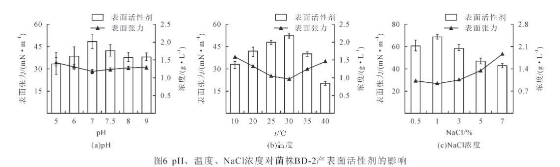 對菌株BD-2在不同的環(huán)境條件下進行了發(fā)酵實驗。如圖6(a)所示,pH在5~7之間,生物表面活性劑量明顯增加,在pH為7時,表面活性劑量最高,為1.64 g/L,而發(fā)酵液表面張力由34.3 N/m下降到28.2 mN/m。pH大于7后生物表面活性劑量顯著下降(P<0.05),表面活性劑量由2.01 g/L下降到1.57 g/L。pH為7后表面張力顯著上升(P<0.05),表面張力由28.2 mN/m升高到31.1 mN/m。研究結(jié)果表明,菌株BD-2在pH為7時生物表面活性劑量最多、表面張力最低,因此,菌株BD-2的最適發(fā)酵pH為7。