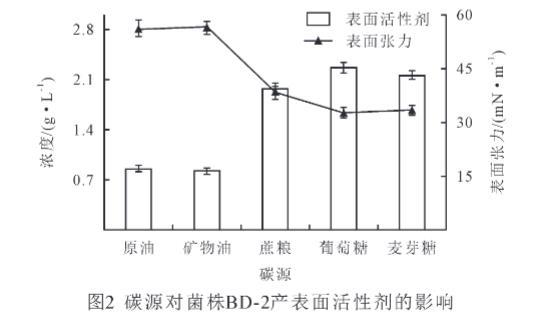 碳源對微生物的生長和次生代謝產(chǎn)物的產(chǎn)生有重要的影響。由圖2可知,不同碳源對菌株BD-2產(chǎn)表面活性劑量的影響不同,本實驗將原油、礦物油作為一類復雜碳源,葡萄糖、麥芽糖、蔗糖作為簡單碳源,進行對比分析發(fā)現(xiàn),以簡單碳源作為底物時,菌株BD-2產(chǎn)表面活性劑的量顯著高于復雜碳源(P<0.05),其產(chǎn)表面活性劑量大小依次為葡萄糖>麥芽糖>蔗糖>原油>礦物油。同時以簡單碳源為底物時,菌株BD-2能顯著降低發(fā)酵液表面張力(P<0.05),其發(fā)酵液表面張力大小依次為原油>礦物油>蔗糖>麥芽糖>葡萄糖。在簡單碳源中,以葡萄糖為碳源時,菌株BD-2產(chǎn)生的表面活性劑的量最高,為2.26 g/L,而表面張力最低,為32.7 mN/m。研究結(jié)果表明,簡單碳源有利于菌株BD-2產(chǎn)表面活性劑。因此,選擇葡萄糖為菌株BD-2的碳源。