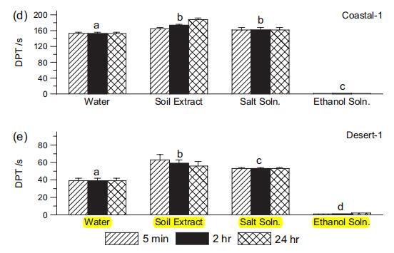 圖 4 水滴滲透時間 (DPT),2:1 w : w 2 小時 用于 Desert-1 和 沿海 1 土壤。 誤差棒顯示重復的標準偏差 滴。 小寫字母給出了兩側 t 檢驗的結果。 不同字母表示均值在 P ? 0.01 顯著性水平。