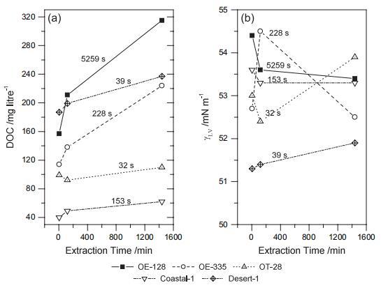 圖2 土壤溶解有機碳(DOC)含量(a)和表面張力(γLV)(b) 提取作為提取時間的函數。 水 以秒為單位的液滴穿透時間 (WDPT) 是 標在面板上。