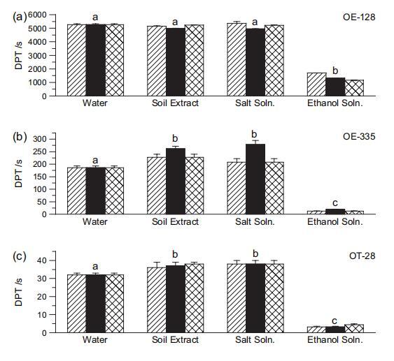 圖 3 液滴穿透時間 (DPT) 水、1:1 土壤提取物、鹽溶液和不同土壤的乙醇溶液:(a) OE-128; (b) OE-335; (c) OT-28; (d) Coastal-1; (e) 沙漠-1。 誤差線顯示標準偏差 復制滴。 小寫字母給出 兩側 t 檢驗的結果。 在給定的 窗格中,不同的字母表示均值 在 P ? 0.01 顯著差異 癌癥水平。 對于 t 檢驗,結果為 三個提取時間(5 分鐘、2 小時和 24 小時)一起考慮,因為它們的 γLV 值非常相似(圖 2b)。