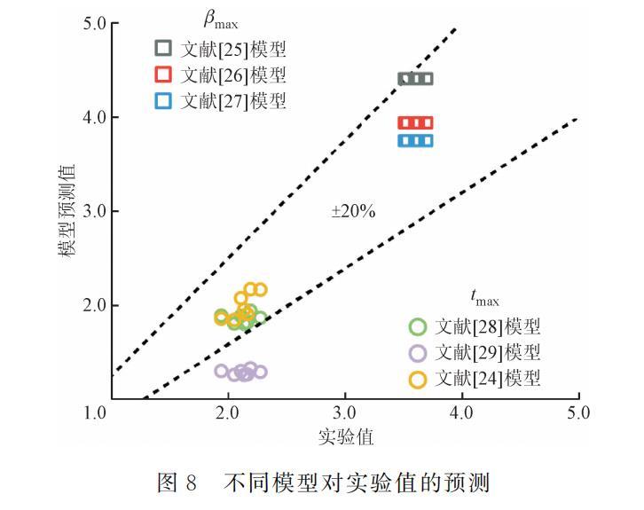 式中:tmax,pre和βmax,pre為使用各模型的最大鋪展時間和最大鋪展因子預測值;tmax,exp和βmax,exp為最大鋪展時間和最大鋪展因子實驗值。如圖8所示,不同公式的預測結果不同,對于最大鋪展因子,盡管不同學者提出的表達式對實驗結果的預測準確率均較好,單個數(shù)據(jù)點的偏差均在20%以內,然而由于表達式的限制,無法針對液滴沖擊不同水平壁面過冷度的實驗工況進行預測,存在一定缺陷。對于最大鋪展時間,Huang和Chen等人提出的表達式預測效果較差,Wildeman等提出的表達式預測效果較好,相對平均偏差為12.32%,但由于其表達式內不包含水平壁面過冷度的影響因素,因而預測效果略差于Shang等提出的表達式,其相對平均偏差為6.05%。綜上所述,現(xiàn)有最大鋪展時間的表達式能較好預測乙醇液滴沖擊過冷水平壁面的鋪展動力學行為,但最大鋪展因子表達式仍需進一步探索。